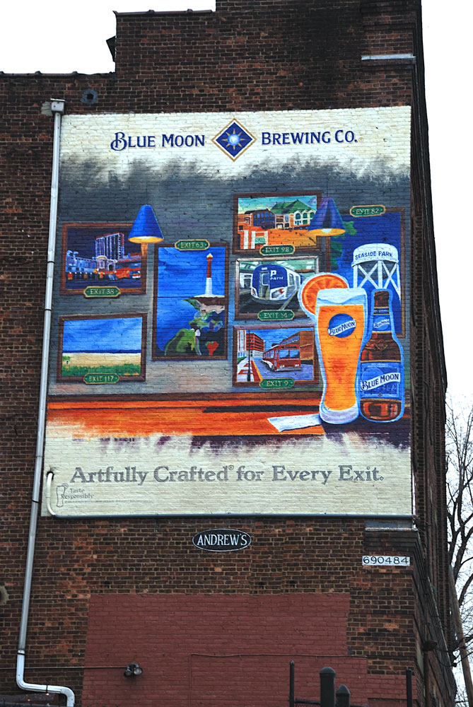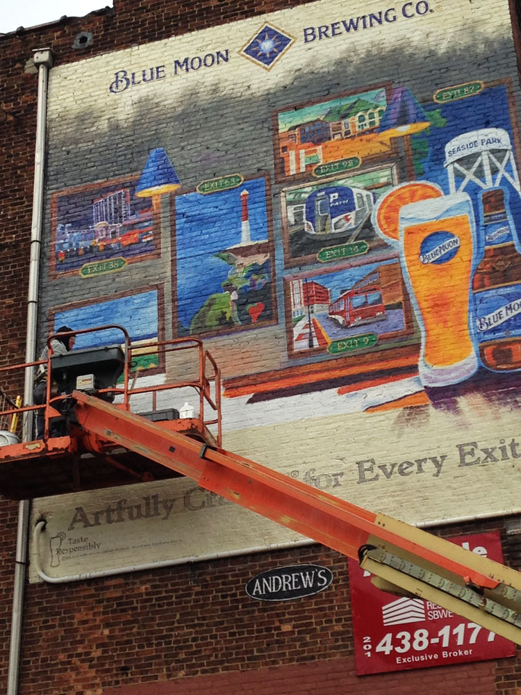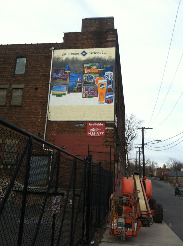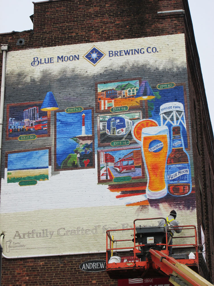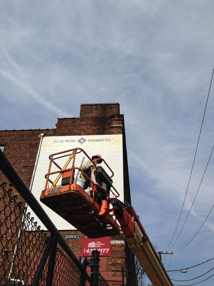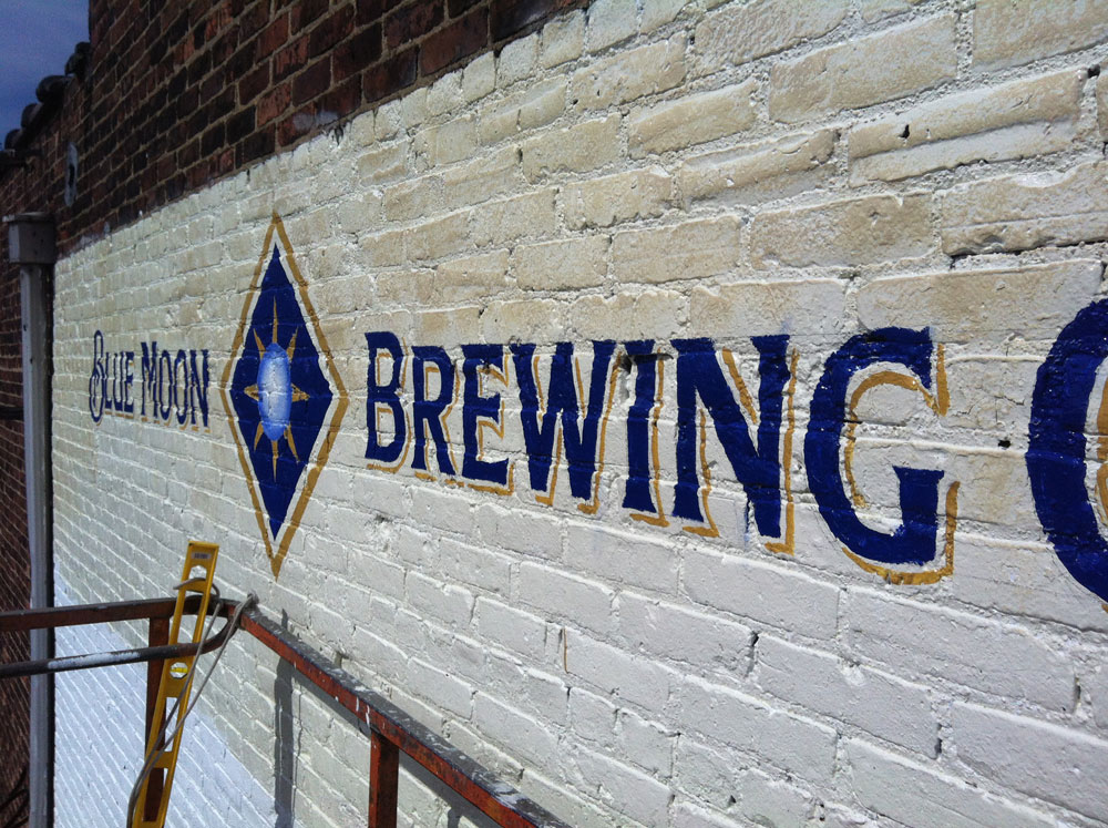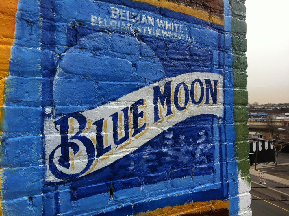 An old-school project, a 19’Wx22’H painted wall sign in Newark NJ. Client: Blue Moon Brewing